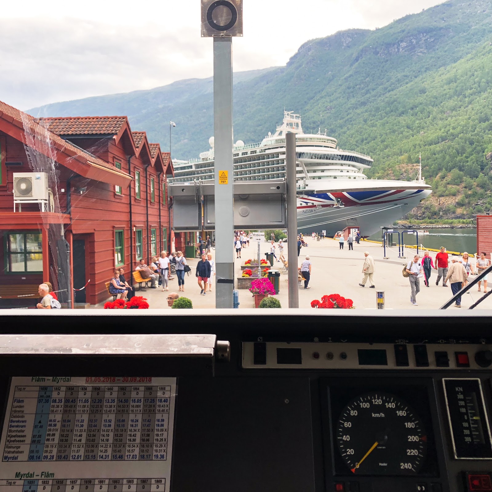 "Szórakoztató kíváncsiság.Flåm egy kicsi település Aurlandban, Norvégiában. 350 ember él ott. A nyári szezonban a mutatószám 100% -kal (idénymunkások) és 1100% -kal növekszik, ha egy hatalmas tengerjáró hajó érkezik Flåmba."